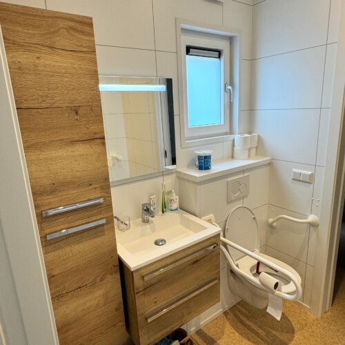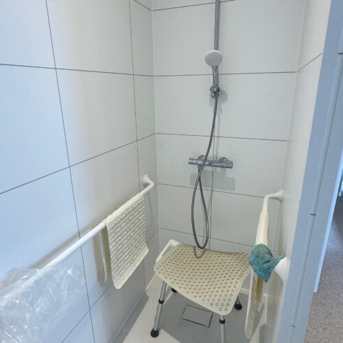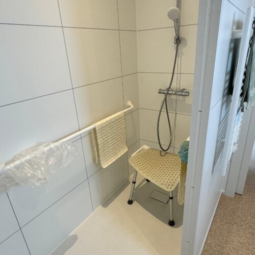 Verder bevat deze aanbouw geen drempels, de hele vloer is gelijk, in de badkamer zijn steunbeugels gemonteerd om het gebruiksgemak te bevorderen, een anti-slip douchebak hebben wij geplaatst om val gevaar tot een minimum te beperken en de vloer in de hele aanbouw is voorzien van een anti-slip laag. Ook zijn er binnen schuifdeuren toegepast voor het gebruiksgemak!